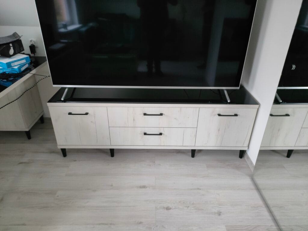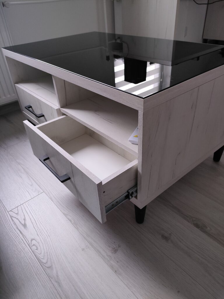 Szafki do pokoju dziennego wykonane z płyty Dąb Craft Biały, z nakładką na blacie ze szkła Lacobel w kolorze czarnym. Tak jakim samym jak uchwyty i nóżki.