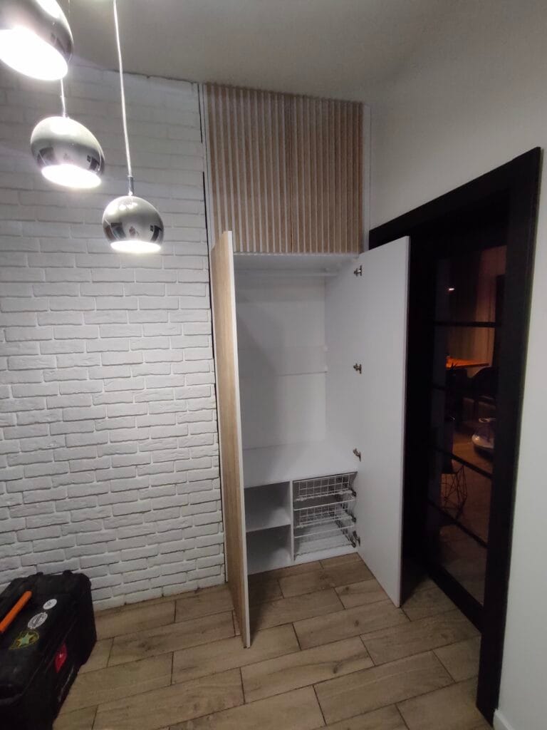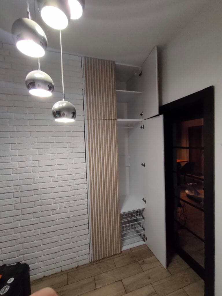 Zabudowa wnęki w przedpokoju klienta. Fronty z modnymi lamelami w odcieniach jasnego drewna na białym tle. Wewnątrz miejsce na powieszenie kurtek oraz odłożenie obuwia w koszach.