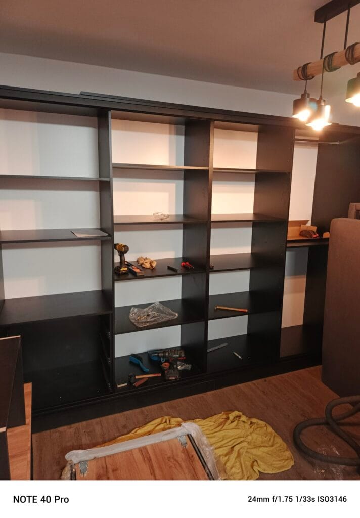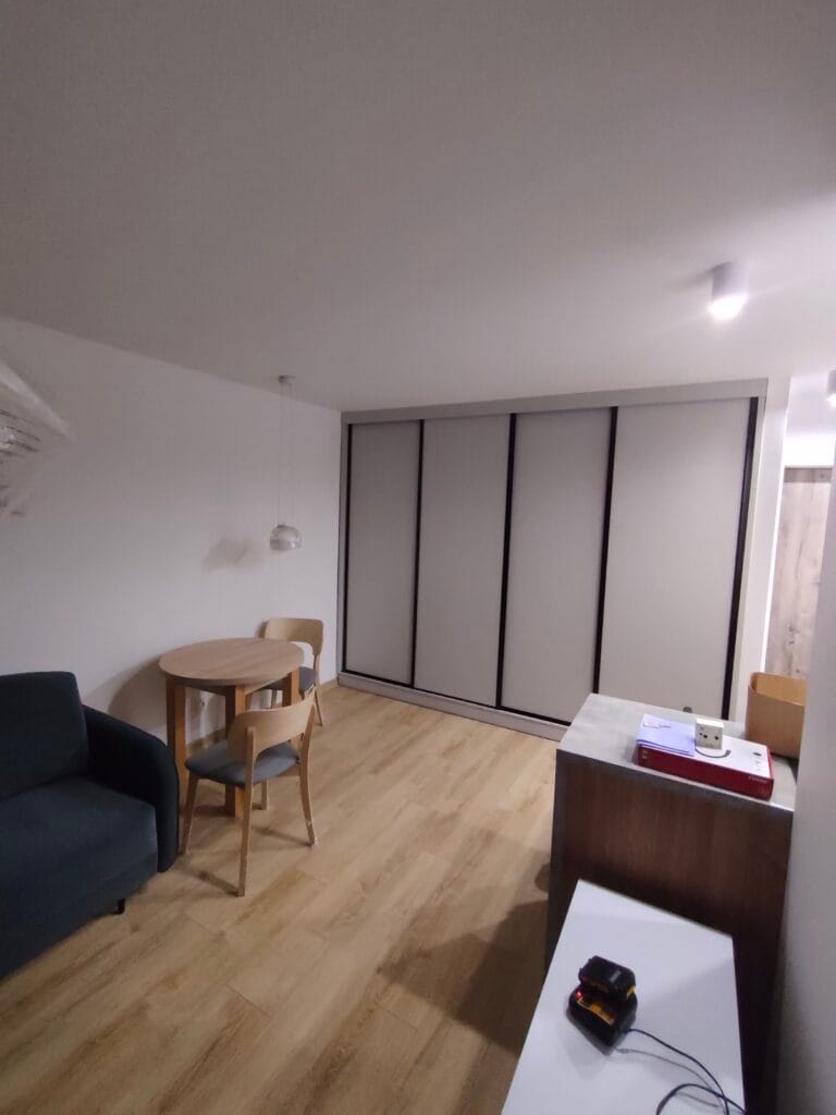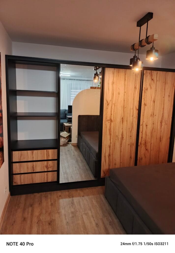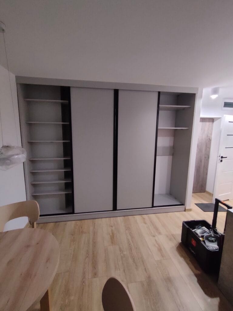 Szafa w salonie w popularnych aktualnie kolorach popielu i czerni. We wnętrzu klient zażyczył sobie, oprócz drążków na wieszaki i półek, również szuflady. Oprócz szafy wyposażyliśmy klientowi całe mieszkanie w meble kuchenne, zabudowę przedpokoju, meble tapicerowane oraz stół i krzesła.