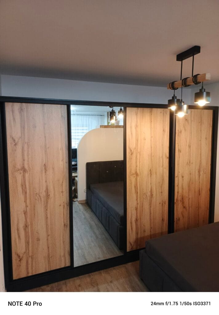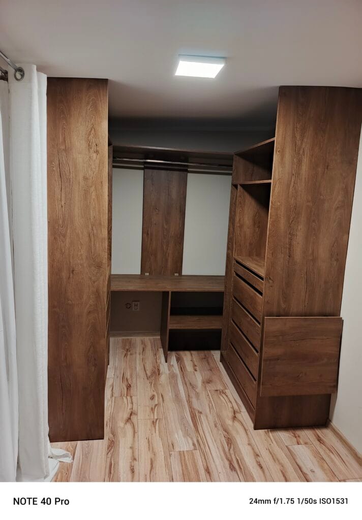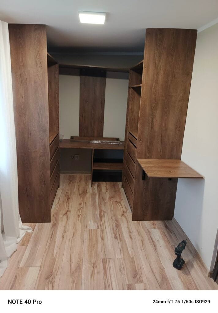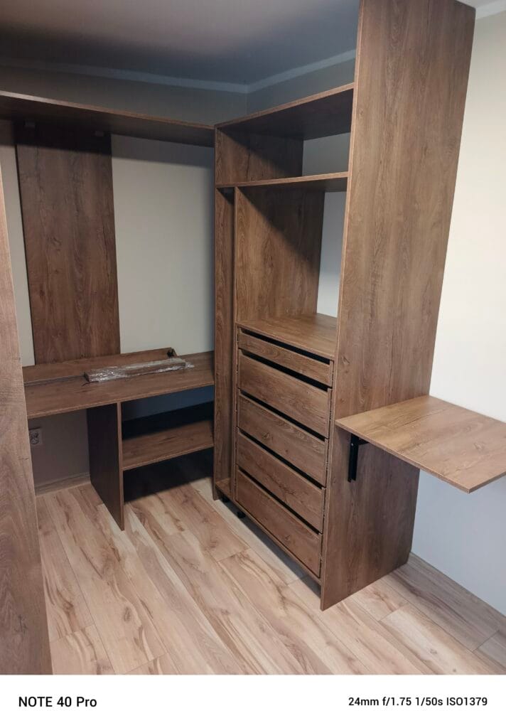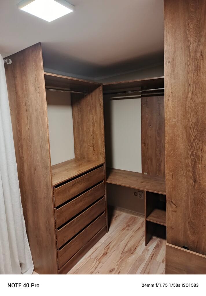 Zabudowa garderoby dla naszej stałej klientki w stonowanym i ciepłym kolorze. Użyto płyty laminowanej o dekorze Dąb Lefkas. Szuflady z mechanizmem cichego domyku oraz składany stolik dają wygodę użytkowania na codzień.